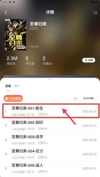 4、在詳情頁,點擊至尊歸來-001-新生選項,開始收聽該有聲讀物。