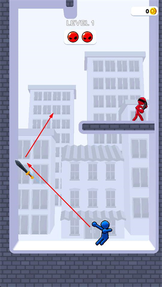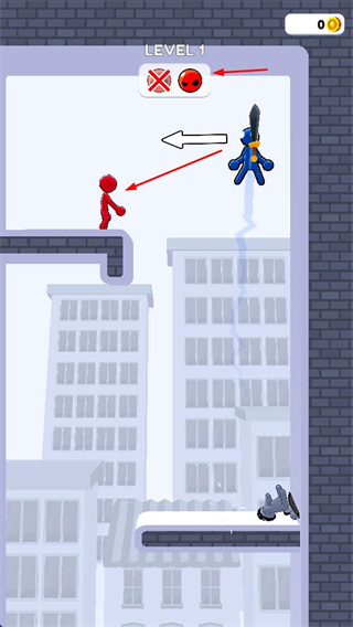 1、在城市建筑場景中,操控藍(lán)色火柴人投擲武器,瞄準(zhǔn)紅色火柴人,利用角度和軌跡擊中目標(biāo)。