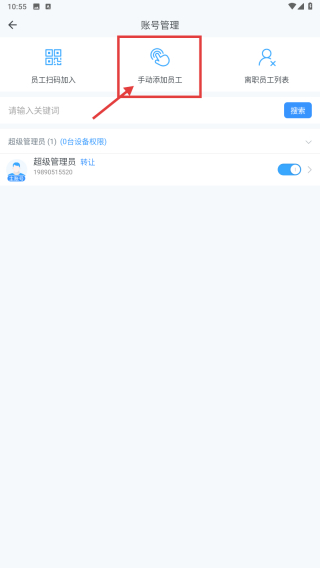 4、在賬號(hào)管理界面,點(diǎn)擊手動(dòng)添加員工選項(xiàng),進(jìn)行員工賬號(hào)添加操作。