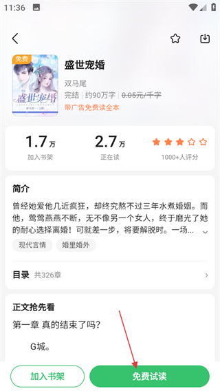 2、在書籍詳情頁面,點擊免費試讀,進(jìn)入書籍閱讀頁面。