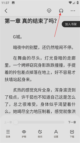 4、在菜單功能頁面,點擊上方耳機圖標(biāo),可使用聽書模式。