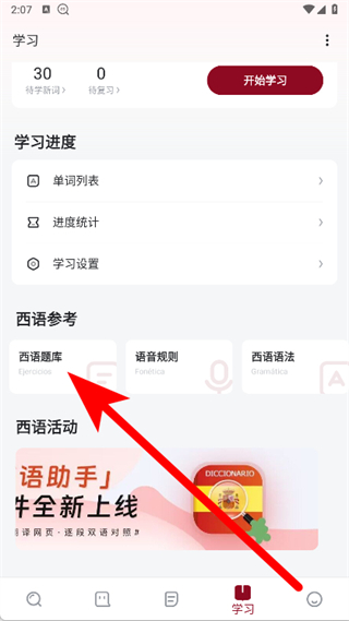 2、在學(xué)習(xí)頁面的西語參考板塊,點擊西語題庫,進入題庫練習(xí)界面。