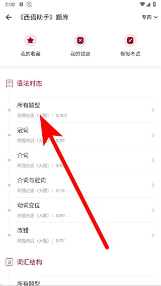 3、題庫中可選擇不同語法題型,點擊進入具體題目練習(xí)。