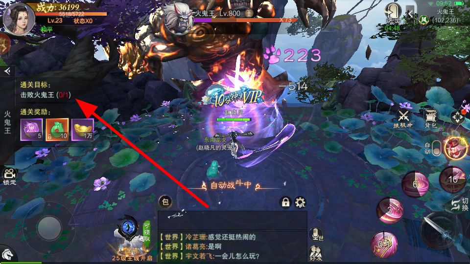 2、戰(zhàn)斗場景中,面對敵人,操控角色施展技能,全力攻擊火鬼王,努力達(dá)成通關(guān)目標(biāo),擊敗敵人完成冒險任務(wù)。