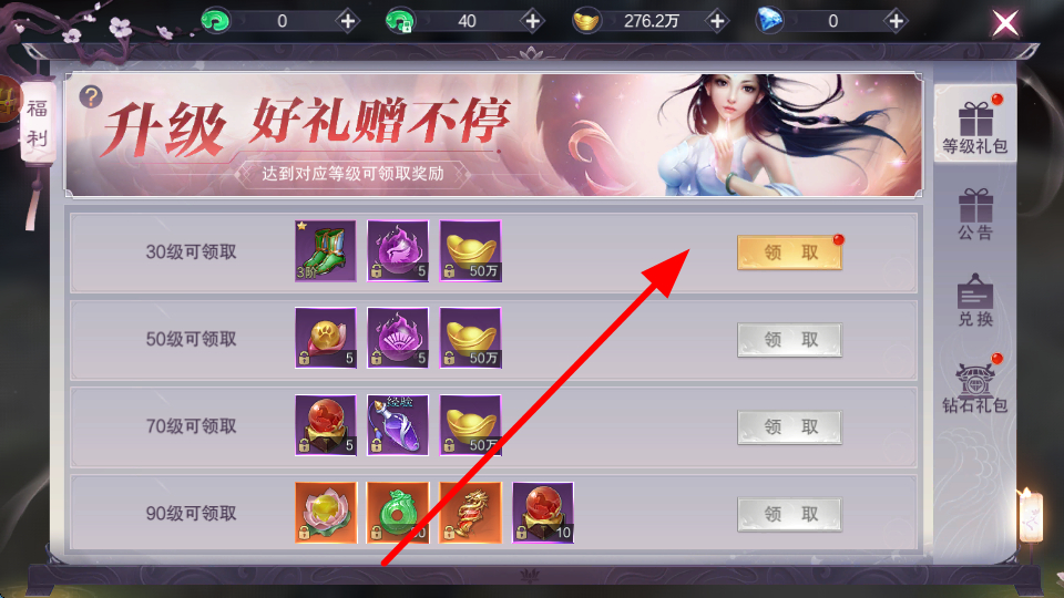 4、當(dāng)角色達(dá)到對應(yīng)等級時,進(jìn)入獎勵界面,領(lǐng)取升級好禮,這些獎勵可用于強(qiáng)化角色,助力后續(xù)更具挑戰(zhàn)的冒險與戰(zhàn)斗。