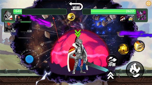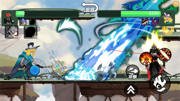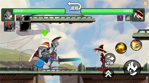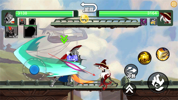 2、點(diǎn)擊虛擬方向鍵靠近對(duì)手,再點(diǎn)擊右側(cè)技能按鈕,像沖刺等技能,對(duì)對(duì)手發(fā)起攻擊。