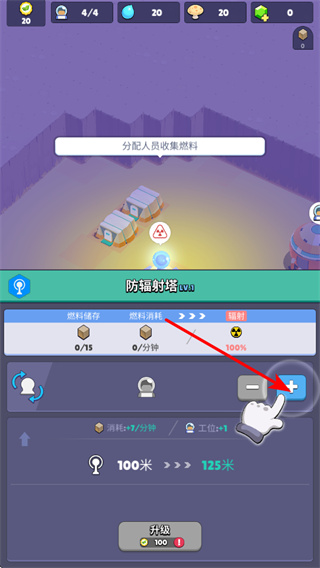 3、分配人員收集燃料,點(diǎn)擊+按鈕增加收集燃料的人員,提升燃料收集效率,提供能源支持。