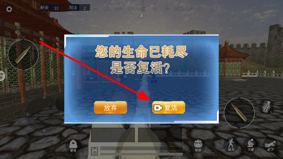 4、玩家被擊敗后,若彈出生命耗盡是否復(fù)活的提示,可選擇復(fù)活選項(xiàng),重新進(jìn)入戰(zhàn)場。
