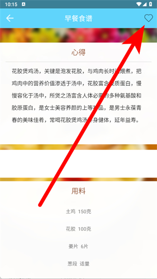 4、進(jìn)入食譜詳情頁后,查看用料、做法等內(nèi)容,點(diǎn)擊右上角心形圖標(biāo)可收藏該食譜。