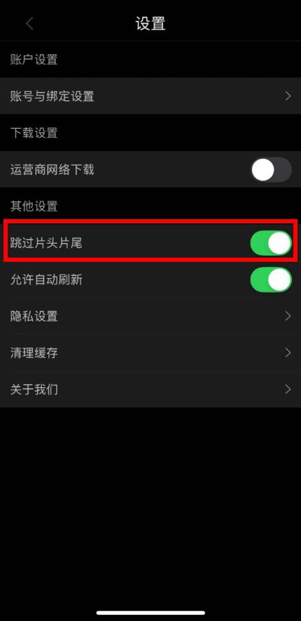3、在設(shè)置界面的其他設(shè)置板塊中,找到跳過片頭片尾選項,點擊右側(cè)開關(guān)將其開啟即可。