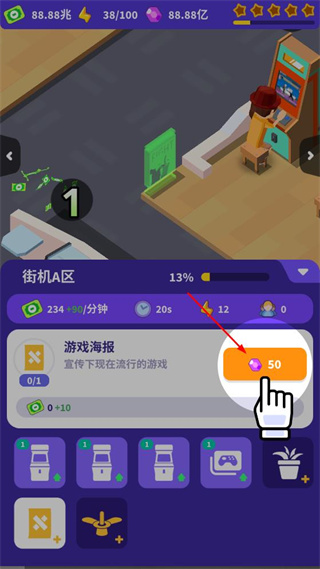 3、道具升級(jí)機(jī)制:支持對(duì)已購(gòu)設(shè)備與場(chǎng)館道具進(jìn)行升級(jí),如提升娃娃機(jī)抓中概率、優(yōu)化賽車(chē)模擬器畫(huà)質(zhì)、增加街機(jī)游戲數(shù)量等,通過(guò)升級(jí)提升顧客體驗(yàn)與消費(fèi)意愿。