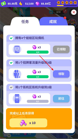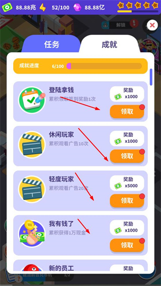 4、達(dá)成成就時(shí),可領(lǐng)取對(duì)應(yīng)的金幣獎(jiǎng)勵(lì),積累資源用于場(chǎng)所的進(jìn)一步經(jīng)營(yíng)和發(fā)展。