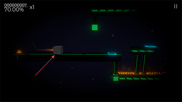 1、進入游戲,操控方塊在平臺上移動,屏幕左上角顯示分數(shù)和倍數(shù),如0000000007x1,70.00%可能是通關(guān)進度。