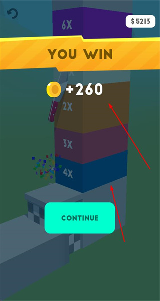 2、當(dāng)成功完成關(guān)卡挑戰(zhàn)后,獲得金幣獎(jiǎng)勵(lì),同時(shí)還有倍數(shù)標(biāo)識(shí),可能代表獎(jiǎng)勵(lì)倍數(shù),之后可點(diǎn)擊CONTINUE繼續(xù)游戲。