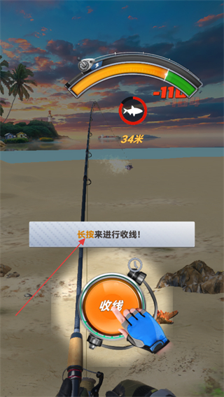 2、當出現(xiàn)長按來進行收線!提示后,點擊并長按收線按鈕,開始收釣魚線。