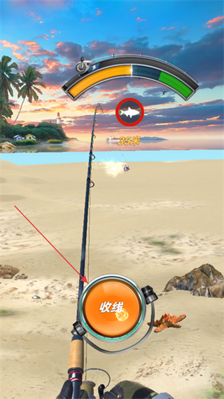 3、收線過程中,留意上方的進度條和魚的圖標,調(diào)整收線節(jié)奏,避免魚逃脫。