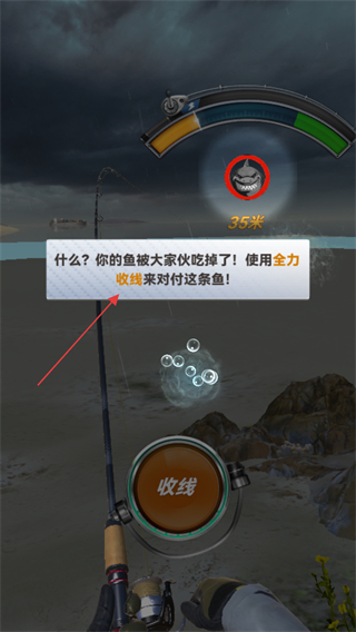 4、遇到提示什么?你的魚被大家伙吃掉了!使用全力收線來對付這條魚!時,加大力度長按收線按鈕,直至成功釣到魚。