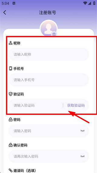 3、在注冊(cè)賬號(hào)信息填寫頁面,輸入昵稱、手機(jī)號(hào),獲取并輸入驗(yàn)證碼。
