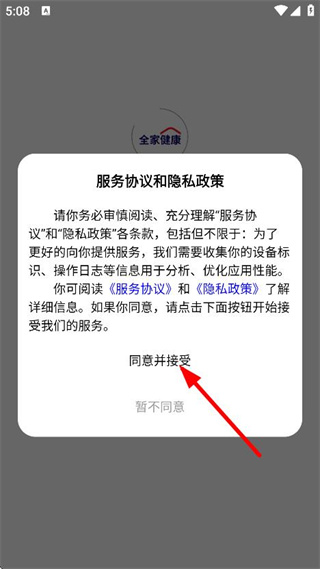 1、在服務(wù)協(xié)議和隱私政策彈窗中,點(diǎn)擊同意并接受,進(jìn)入登錄注冊(cè)頁面。