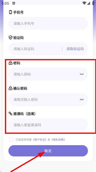 4、輸入密碼、確認(rèn)密碼,選填邀請(qǐng)碼,勾選協(xié)議后,點(diǎn)擊確定,完成注冊(cè)。