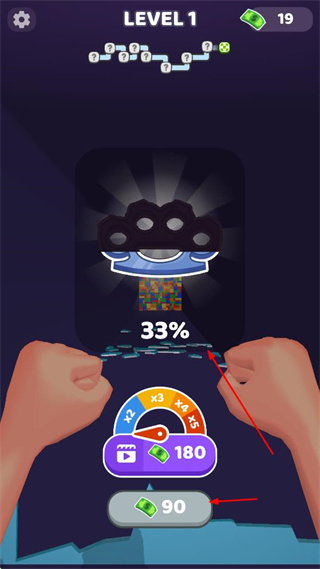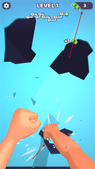 1、玩家通過點擊或長按屏幕,操控拳頭去破壞不同的物體,每次成功破壞物體,都能獲得金錢獎勵,比如+1金錢,右上角會顯示當前擁有的金錢數(shù)量。