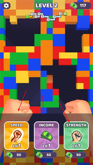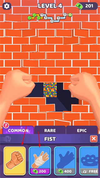 4、隨著關卡推進,破壞的物體會變化,從黑色塊狀物到彩色方塊、磚墻等,而且還能解鎖不同類型的拳頭,有普通、稀有、史詩等品質。