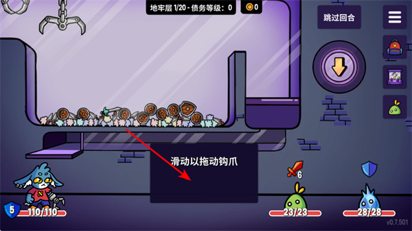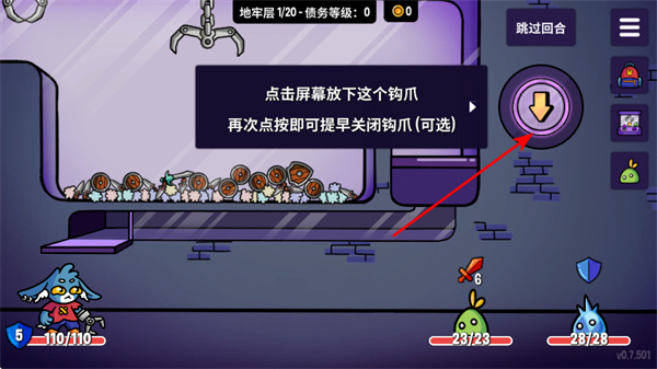 2、釋放鉤爪點(diǎn)擊屏幕放下鉤爪,再次點(diǎn)擊可提早關(guān)閉鉤爪,抓取地牢中的物品,積累資源。