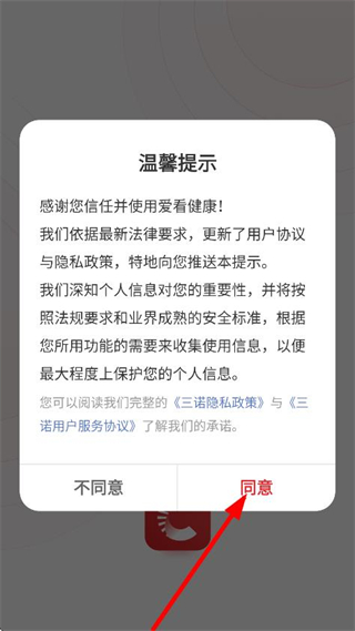 1、在溫馨提示彈窗中,點(diǎn)擊同意,進(jìn)入愛看健康的主頁面。