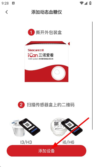 3、在添加動(dòng)態(tài)血糖儀頁面,點(diǎn)擊添加設(shè)備,進(jìn)入附近設(shè)備掃描頁面。