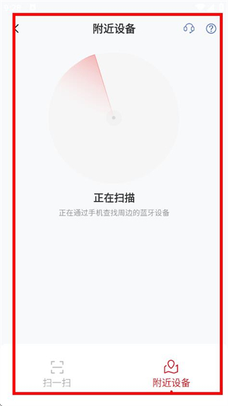 4、在附近設(shè)備掃描頁面,可查看正在掃描附近藍(lán)牙設(shè)備的狀態(tài)。