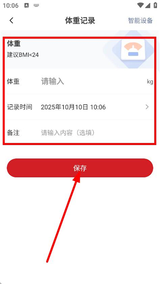 4、在體重記錄頁(yè)面,輸入體重等信息后,點(diǎn)擊保存,完成體重記錄。