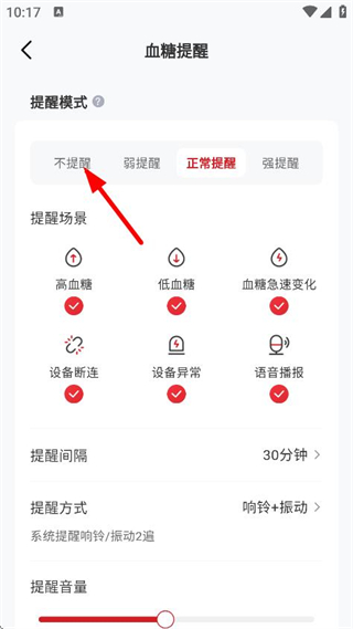 3、血糖提醒設置頁面,點擊不提醒,選擇關閉提醒模式。