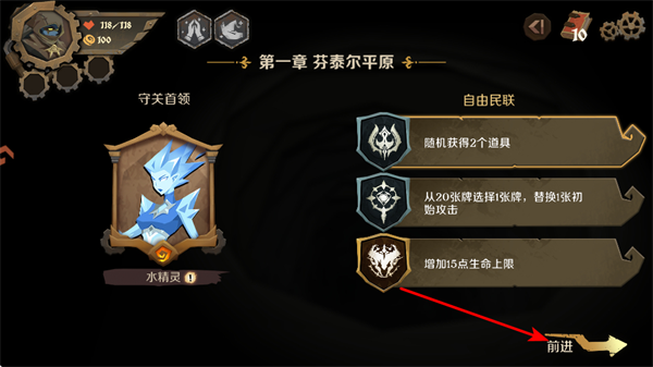 1、開始推進(jìn)關(guān)卡,點(diǎn)擊前進(jìn)按鈕,進(jìn)入芬泰爾平原的關(guān)卡地圖,開始游玩探索進(jìn)程。