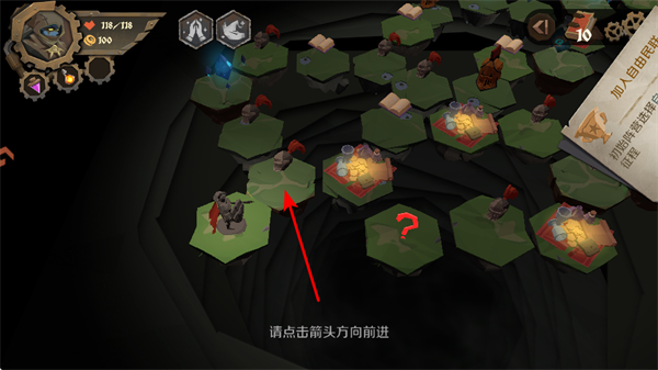 2、移動(dòng)來探索,關(guān)卡地圖中點(diǎn)擊箭頭方向前進(jìn),探索六邊形地塊,觸發(fā)事件遭遇敵人。