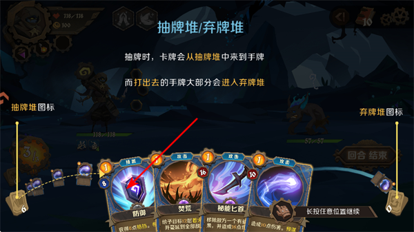 3、卡牌操作,了解抽牌堆和棄牌堆機(jī)制,抽牌補(bǔ)充手牌,打出卡牌進(jìn)行攻擊、防御操作。