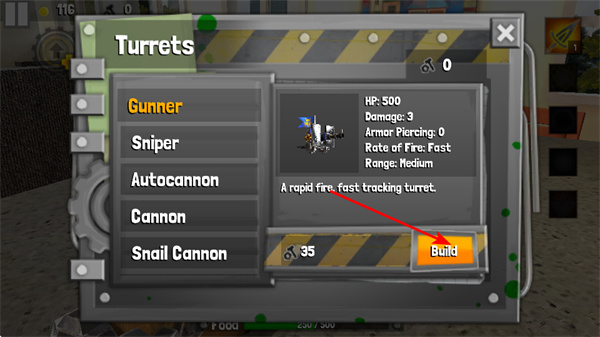 3、在炮塔界面選擇Gunner類型,點(diǎn)擊Build按鈕建造,利用其快速追蹤增強(qiáng)防御能力。