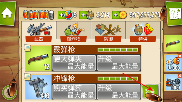 3、升級(jí)武器,在武器界面中對(duì)沖鋒槍等武器進(jìn)行升級(jí),點(diǎn)擊裝備按鈕,從而獲取經(jīng)驗(yàn)升級(jí)。