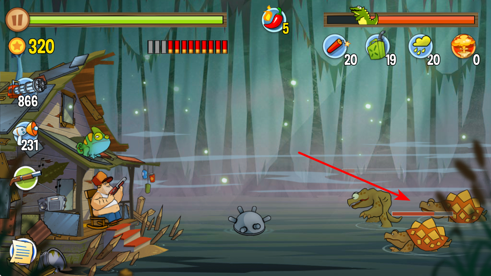 采用美式卡通畫風(fēng)打造游戲畫面,場景聚焦沼澤區(qū)域,角色設(shè)計充滿趣味,玩家扮演木屋主人手持武器從容應(yīng)戰(zhàn),沼澤動物雖拿著電鋸、噴火槍等裝備。