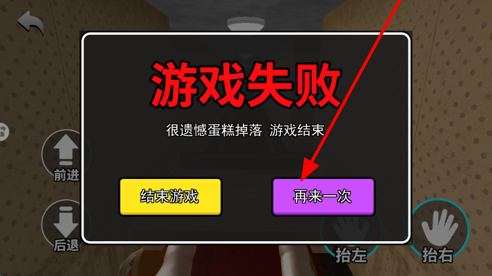 4、失敗重來,若蛋糕掉落導(dǎo)致游戲失敗,點(diǎn)擊再來一次按鈕,重新開始游戲,再次嘗試成功運(yùn)送蛋糕。