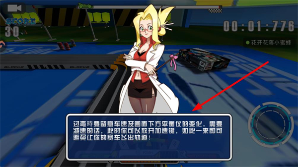 3、進入比賽后,注意游戲中的提示,過彎時要留意車速及畫面下方平衡儀的變化,需要減速就放開加速鍵,避免賽車飛出賽道。