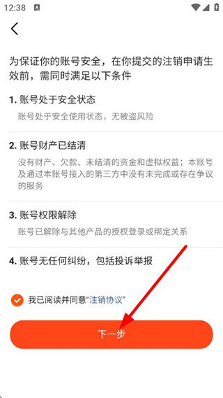 4、在賬號注銷條件說明頁面,點擊下一步,繼續(xù)賬號注銷流程。