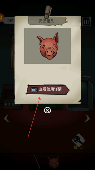 4、點擊查看貢品豬頭道具,選擇查看使用詳情,依據(jù)提示將道具用在合適地方推進劇情。