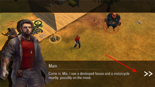 1、點(diǎn)擊箭頭按鈕,推進(jìn)游戲劇情,了解角色發(fā)現(xiàn)的場景信息如被摧毀的房屋。