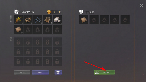 4、收集物資,點(diǎn)擊TAKE ALL的按鈕,收集場景中的所有的物資,為生存發(fā)展做準(zhǔn)備。