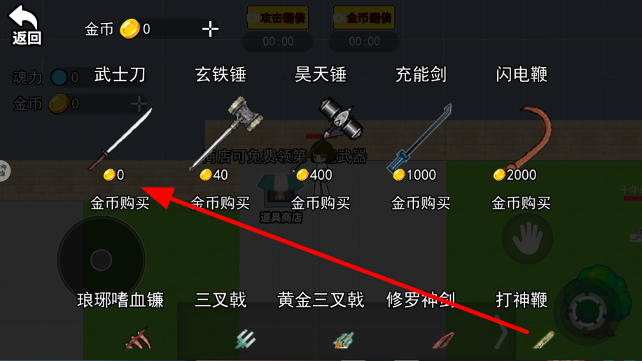 2、武器商店,有武士刀、玄鐵錘等多種武器,擁有足夠金幣時,點(diǎn)擊武器進(jìn)行金幣購買,就能獲取該武器。