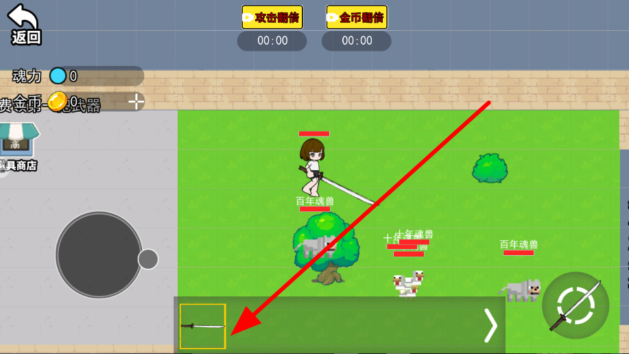 3、武器會出現(xiàn)在下方武器欄中,點(diǎn)擊武器欄里的武器,角色就會裝備并使用該武器,對敵人發(fā)起攻擊。