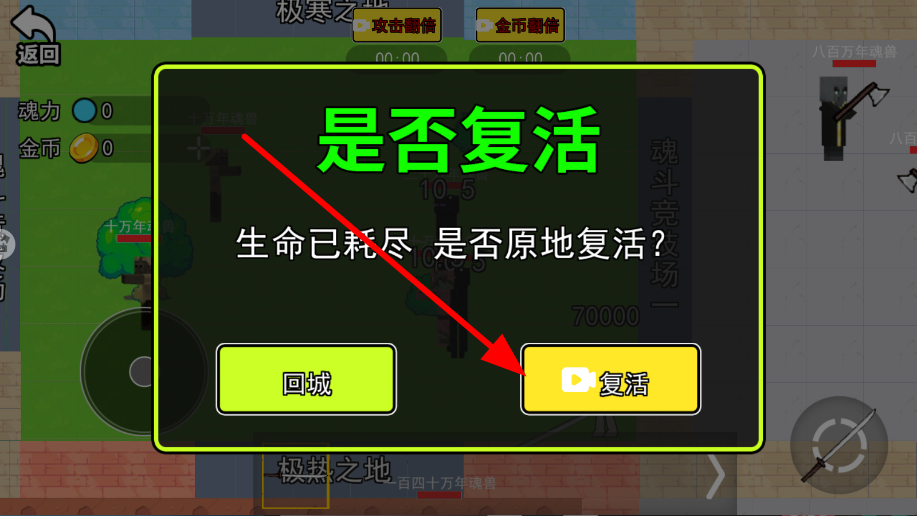 4、當(dāng)角色生命耗盡時,會彈出是否復(fù)活的提示界面,此時點(diǎn)擊復(fù)活按鈕,讓角色原地復(fù)活,繼續(xù)參與戰(zhàn)斗。
