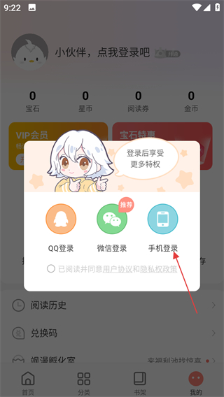 3、在登錄引導(dǎo)界面,選擇手機登錄,進入手機登錄頁面。
