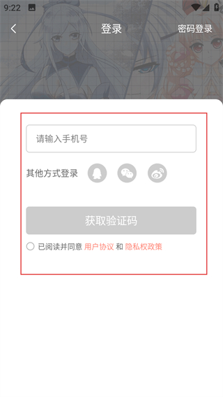 4、在手機登錄頁面,輸入信息勾選協(xié)議后,完成登錄操作。
