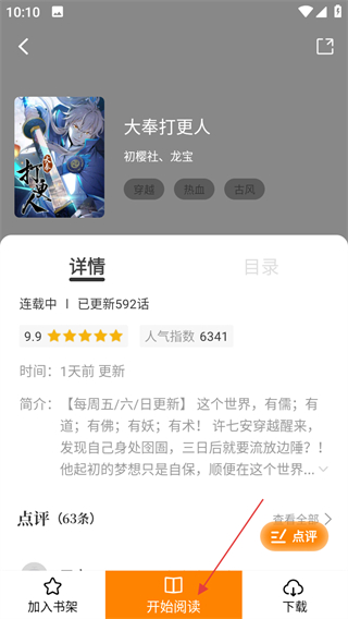 3、在大奉打更人詳情頁面,點(diǎn)擊開始閱讀,進(jìn)入漫畫閱讀頁面。